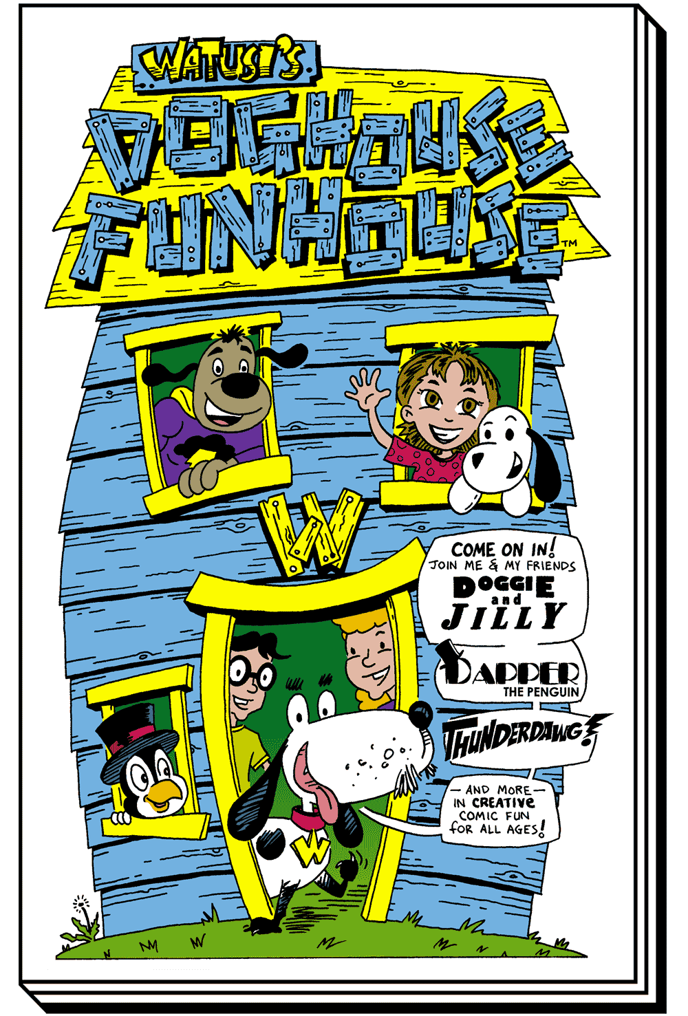 Watusi’s Doghouse Funhouse #1 is a 52-page black & white digest w/full-color covers.