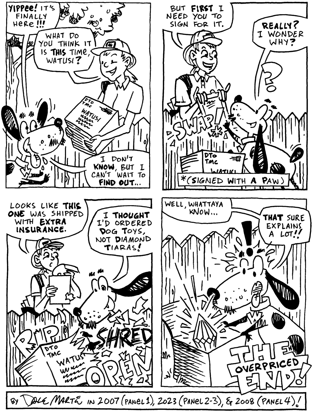 Yep, it’s another “done in one” episode, this time killing two birds with one stone for me: I tried to shoehorn the ending panel from my “backwards” jam (where I started with the ending, and participants built the story backwards) with a starter to another strip. Not sure how successful this mashup worked, but it was fun to try. The “backwards” starter was the last one (if I recall correctly) I made back during Watusi’s collaborative comic era. Others who’ve attempted it had their comics printed in Watusi # 29 & #38, if you’re curious as to how it worked out for them…
