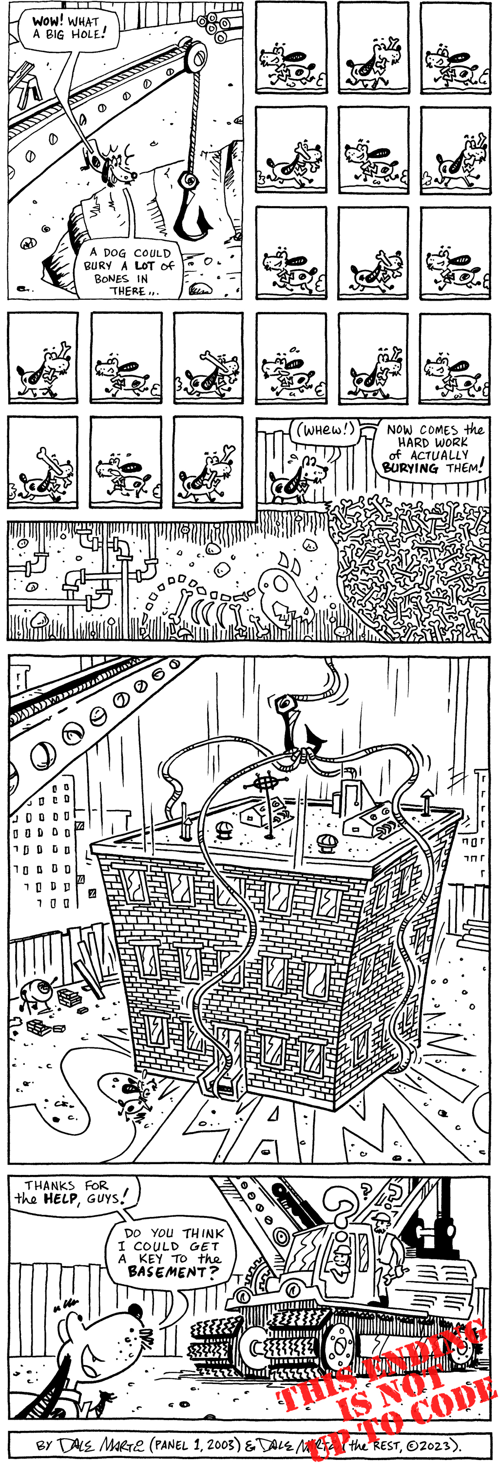 1. That first panel is truly a blast from the past! It wasn’t my first Watusi jam comic, but I remember doing a second panel for this years ago! A construction guy asking Watusi about his absent hardhat, Those were the days! I like the twist ending and the punchline, Dale! Proof you can actually revisit your older work and make it sing again!