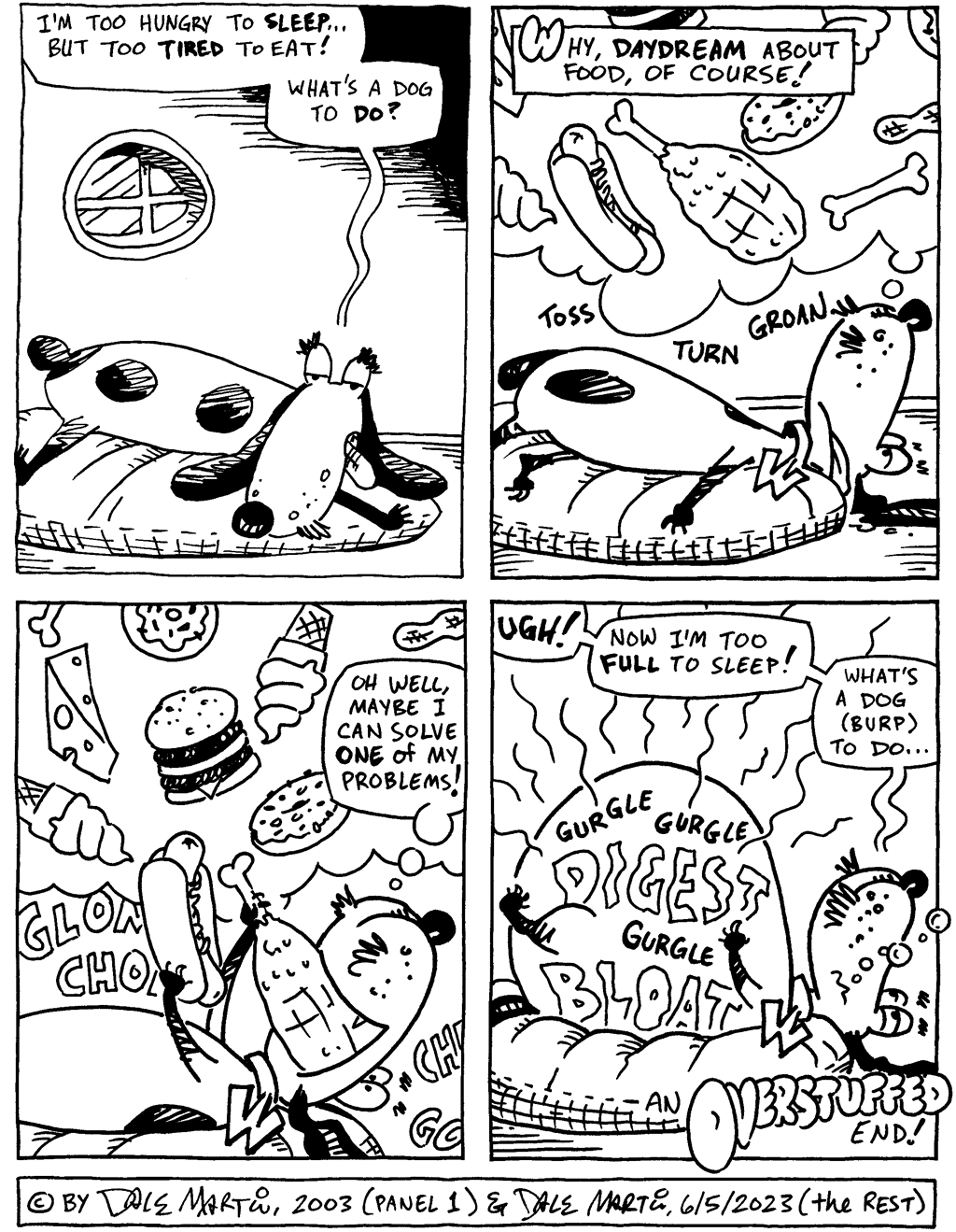 I call this the “Killing them with kindness” version of this story starter! As I’ve been looking back at the starter panels from Watusi’s first few years, I couldn’t help but tackle this one, especially when I noticed the serendipity of its upcoming anniversary. I guess either this silly talking dog idea has had more longevity than I ever expected it to … or I haven’t had a fresh idea in 20 years!