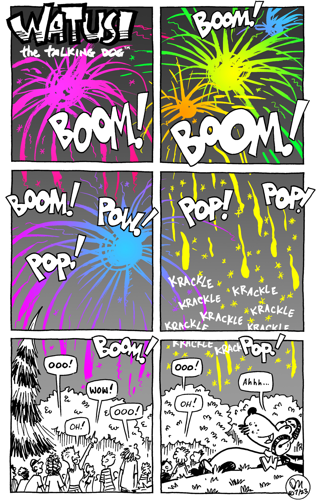 I thought I’d revisit another of my old Watusi starter panels, especially since I’ve never really used Lester the barking boy all that much. He’s still a mystery to me (is he a feral child? is he a kid who likes to pretend he’s a dog? does he just have a speech impediment?), but working on this did teach me a couple of things about him: he’s younger than Kirby and Emma and their kid cohort, and Watusi– but not the reader– can understand him perfectly!