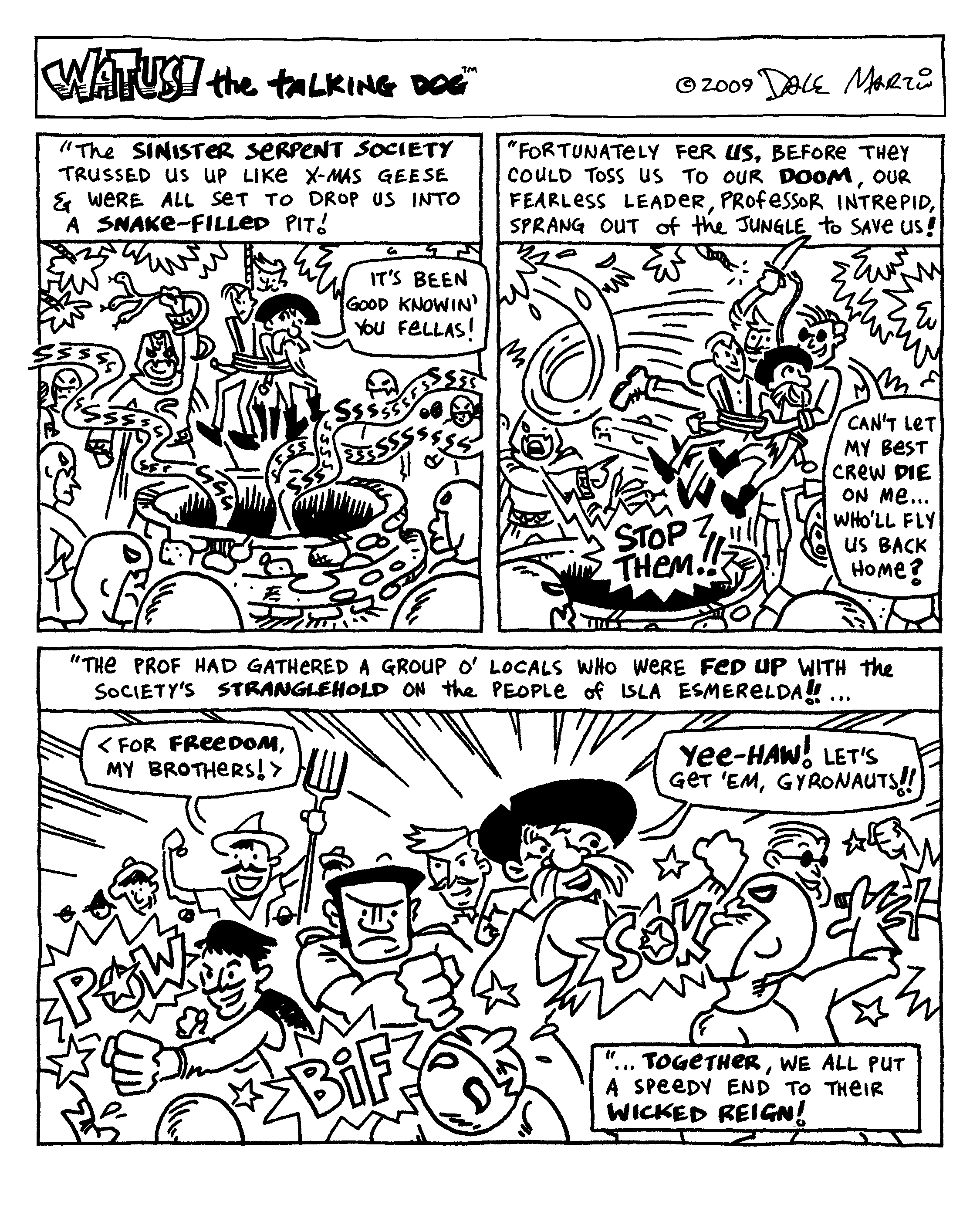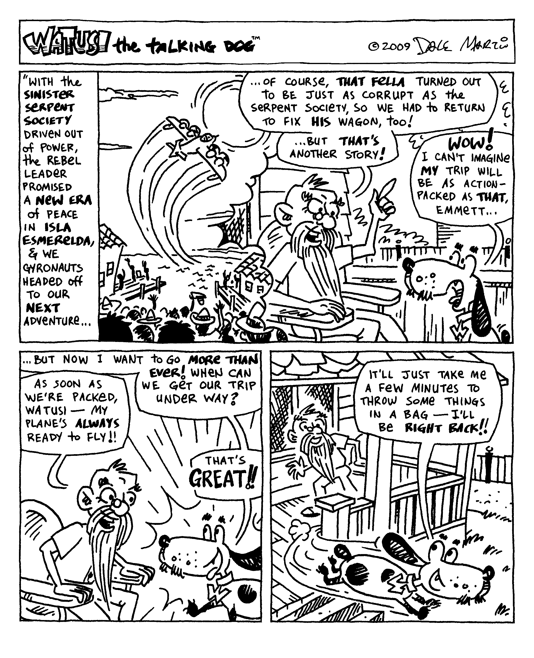 Watusi says: “Wait a minute … where am I in this week’s comic?!? I thought this was supposed to be my comic strip! Instead you’re turning it into some kind of pulp adventure featuring Emmett!”