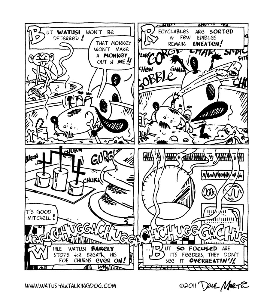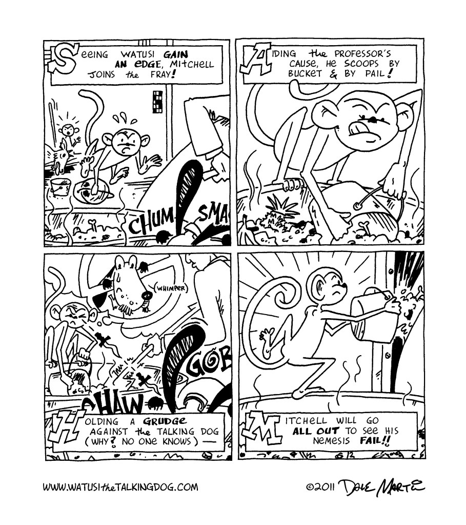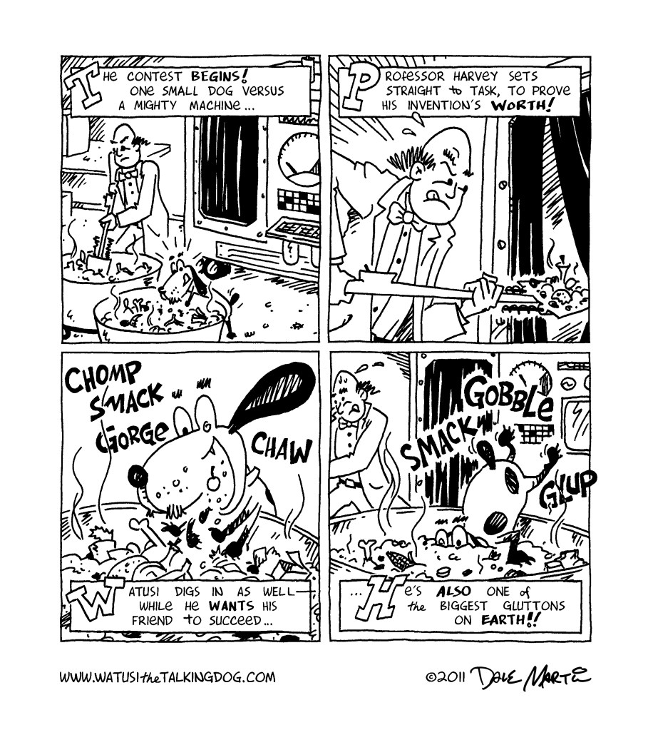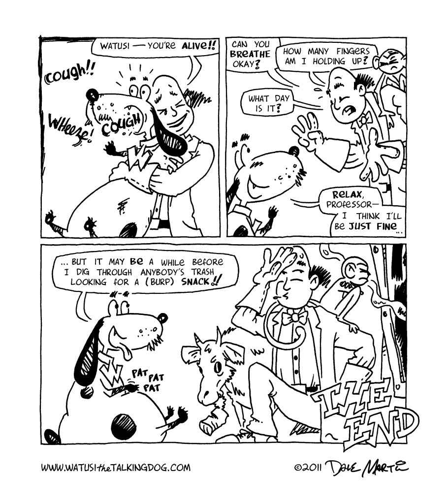 Oh my gosh – Watusi survived!! Guess having a site named “Watusithetalkingdog” kinda takes some of the dramatic tension out of a death scene, doesn’t it? Still, I would be interested in hearing what you thought about this storyline; while I plan to have a mix of these shorter stories and longer epics, I’m curious to hear what you readers prefer!