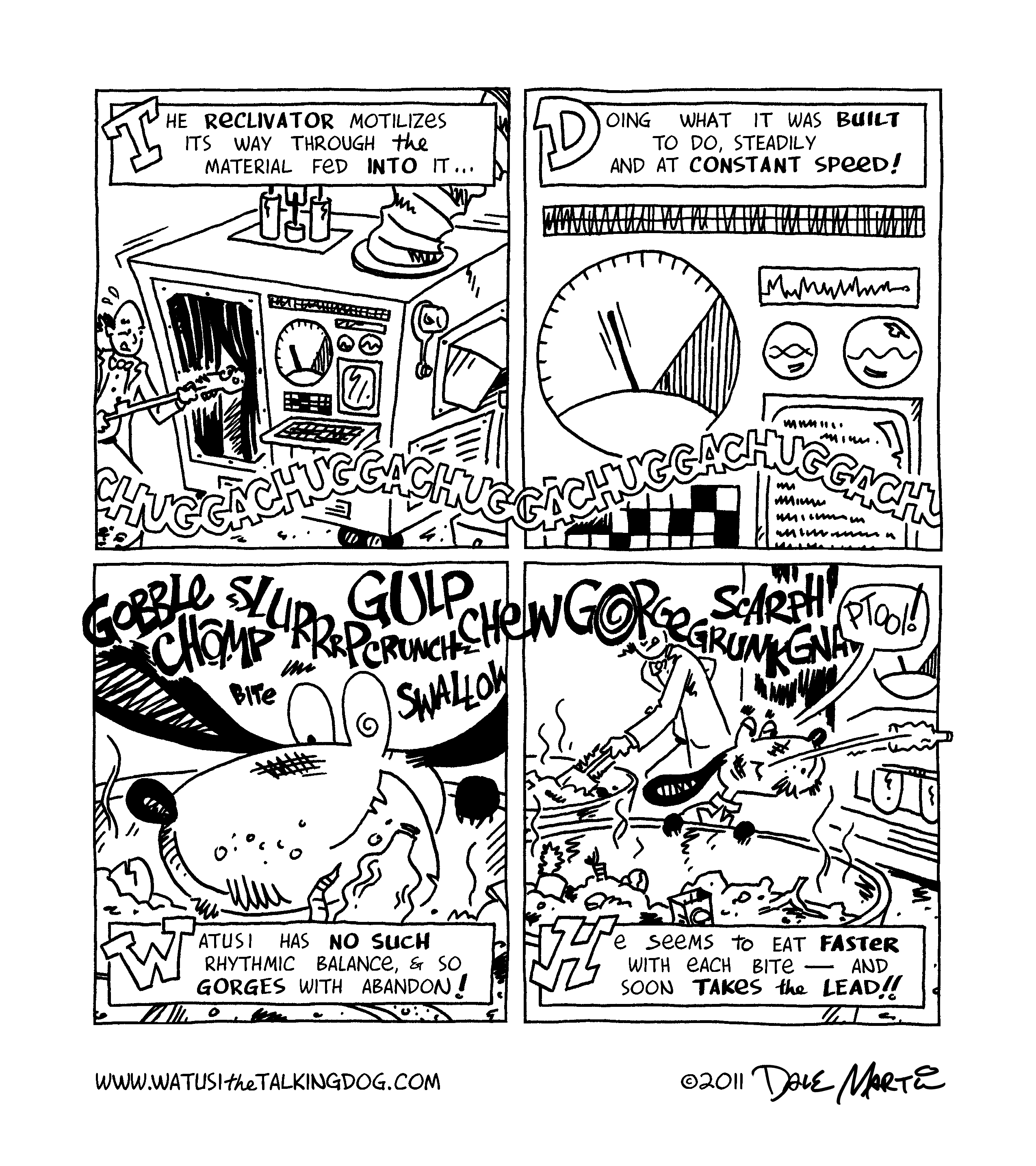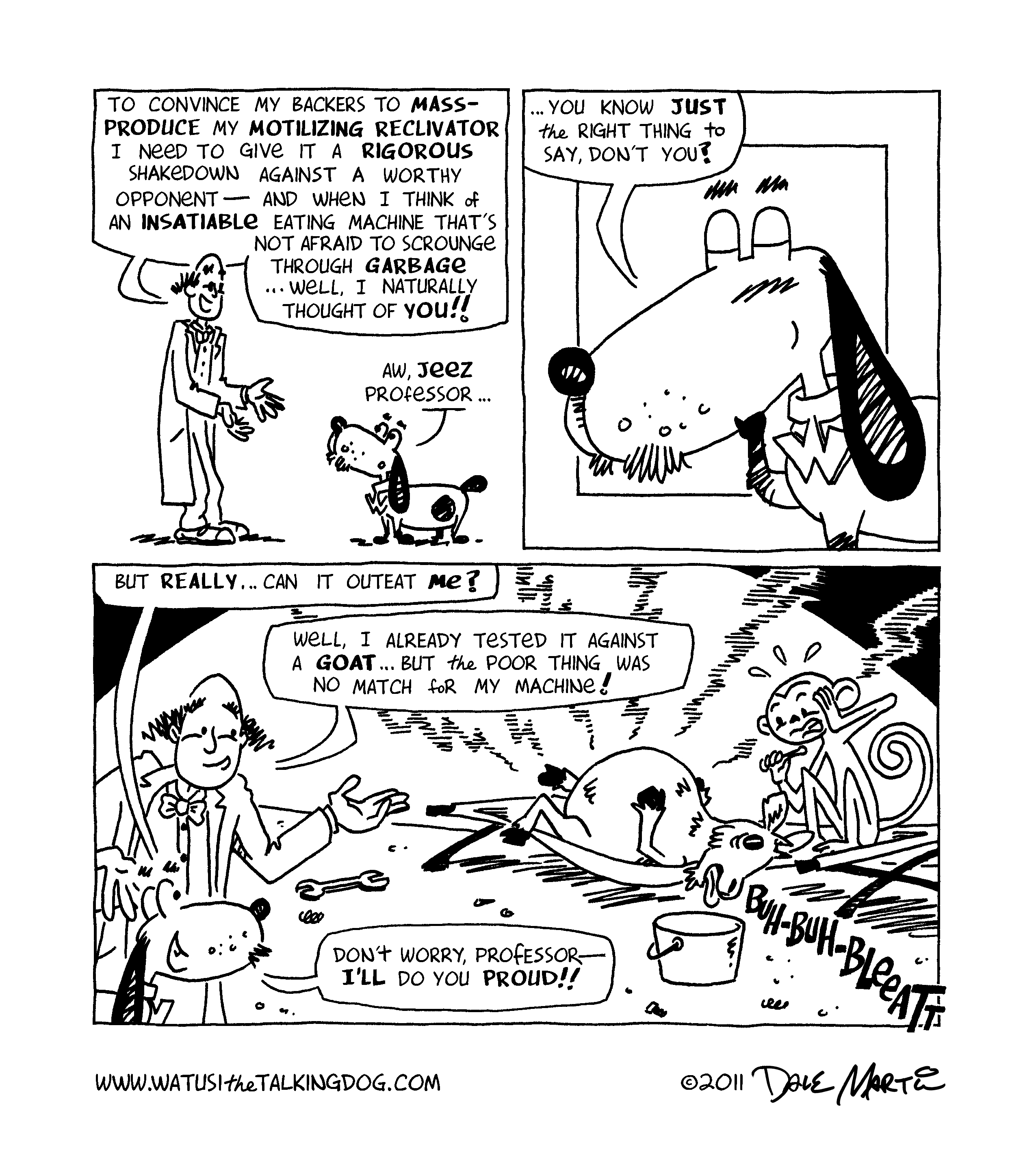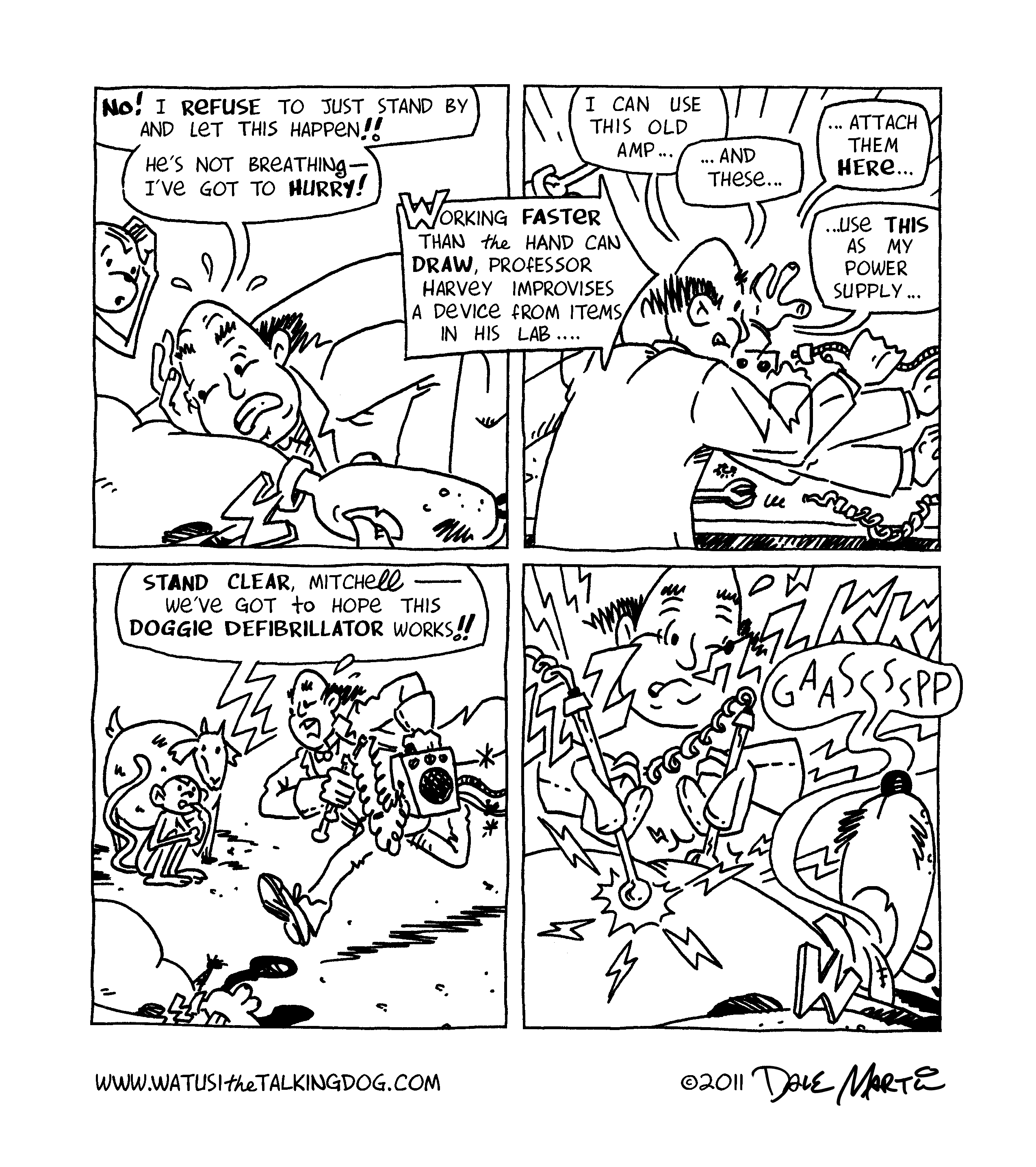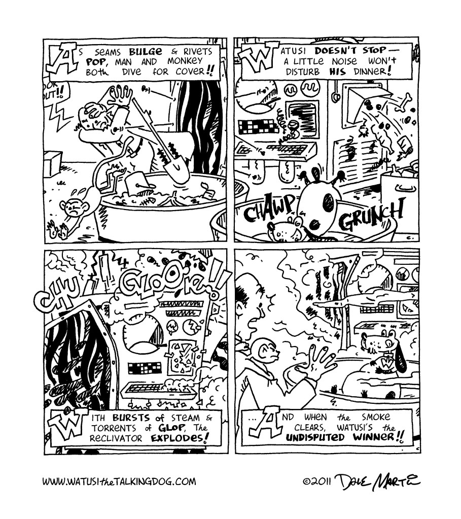 Oh my gosh – Watusi survived!! Guess having a site named “Watusithetalkingdog” kinda takes some of the dramatic tension out of a death scene, doesn’t it? Still, I would be interested in hearing what you thought about this storyline; while I plan to have a mix of these shorter stories and longer epics, I’m curious to hear what you readers prefer!