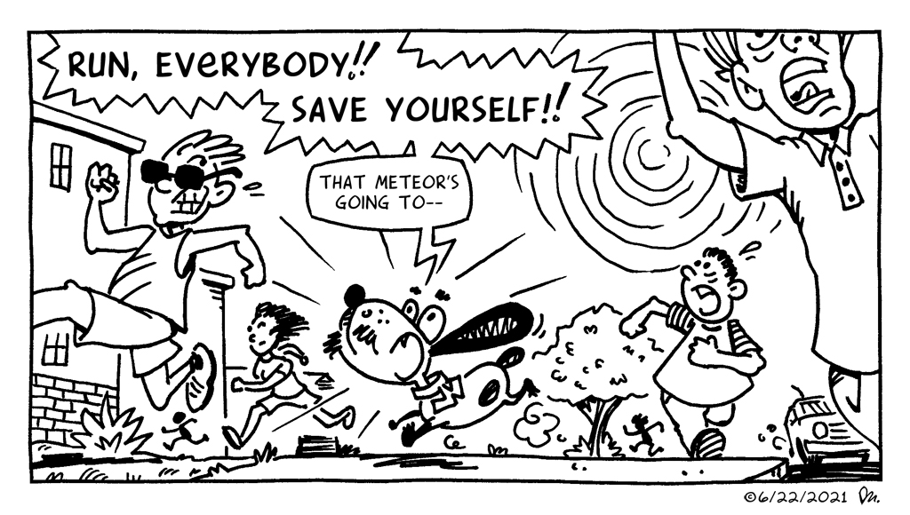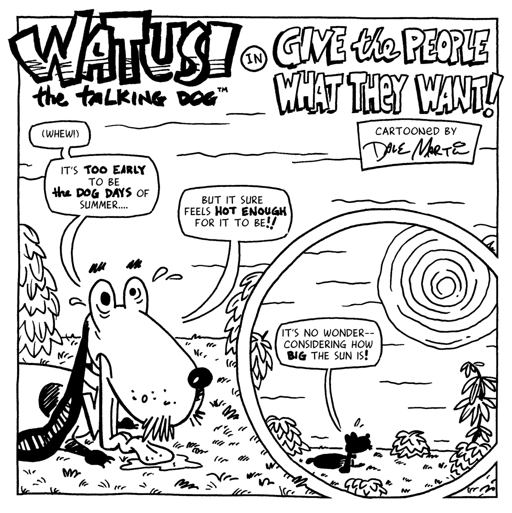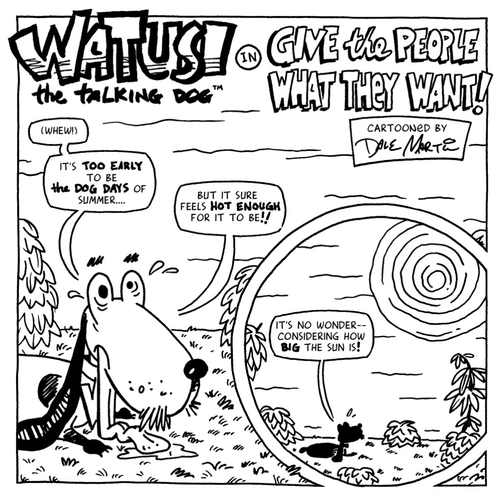 With the recent completion of my Watusi in Oz adventure– along with giving myself a sabbatical from the weekly deadline merry-go-round– I’ve been able to take a deeper dive into projects I’ve had sitting on the back burner far too long (including Watusi the Talking Dog #40). Still, I’ve been feeling a bit of Watusi withdrawal (maybe you have, too?), so I thought I’d make a new monthly comic, something loose & playful, just for my newsletter subscribers instead of posted to the open web. You can read the rest of this strip in my May newsletter (and subscribe, if so inclined) …