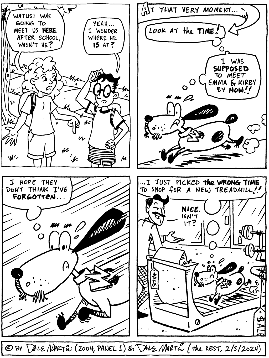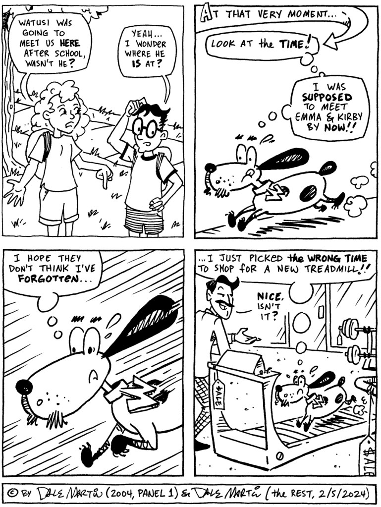 So, you may ask, what’s next for Watusi & company? What’s next for me? Well, as I wrote back in January, I’m stepping off of this weekly deadline merry-go-round to work more deeply on projects other than this online comic. Of course, since I’m likely to go into Watusi withdrawal, rest assured there will be more canine capers coming in the future! You can find out about those– and whatever else is coming next– in my monthly newsletter; if you haven’t already done so, you can subscribe here.