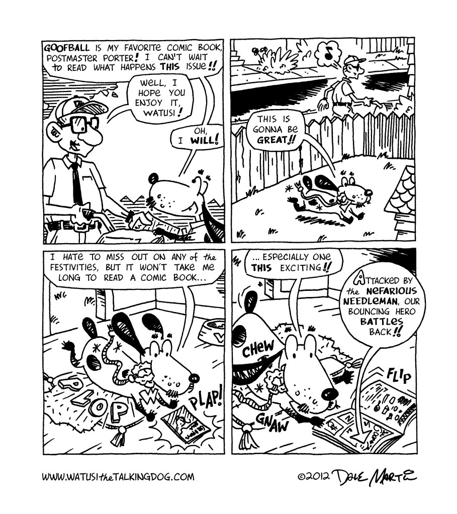 Couldn’t pass up the chance to draw Li’l Watusi again … or to give him a more typical relationship with his mail carrier, short-lived tho it may have been!