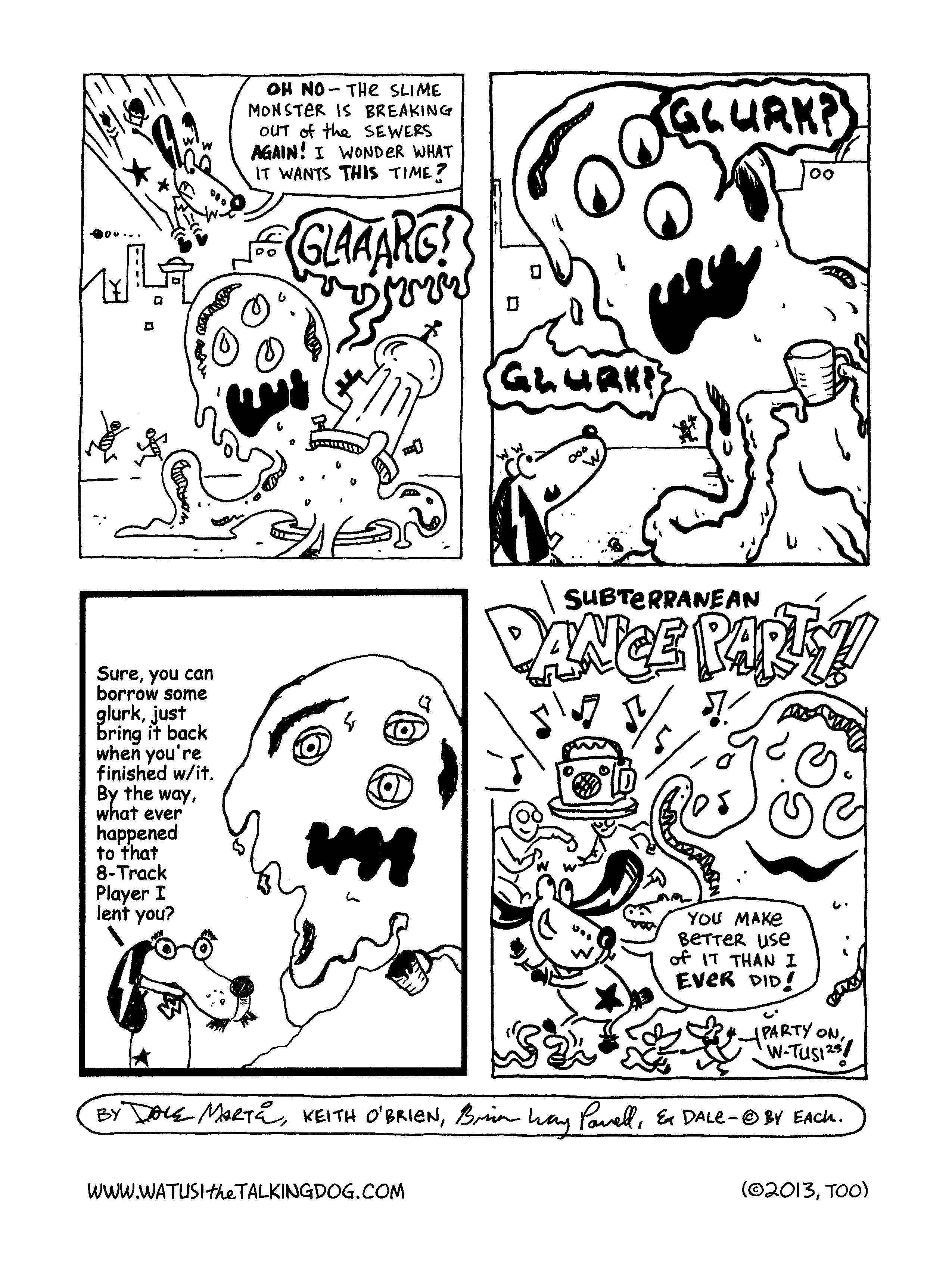 This is another alternate take on a previously published strip; the version of this comic I finally picked had a drier wit to it, but I’m glad I revisited this “dance party” ending, as I like it more now than I did when I was sketching up possible endings. You can see the one I picked in Watusi #28 (June 2013).